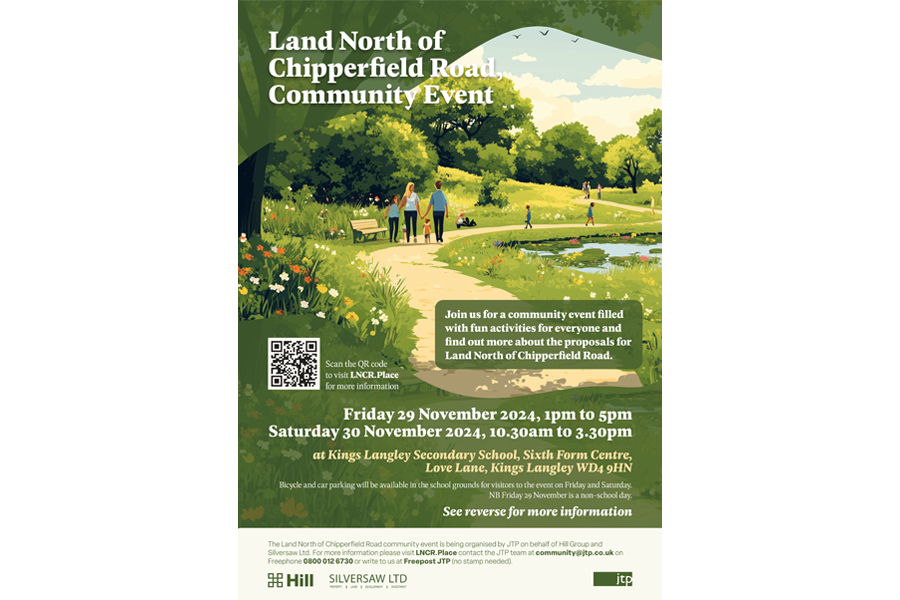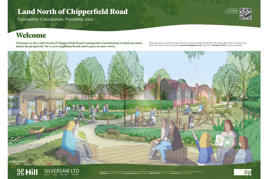 The Land North of Chipperfield Road website is designed and maintained by JTP on behalf of Silversaw Ltd and Hill Group For more information, contact the JTP Community Planning team at community@jtp.co.uk on Freephone 0800 0126 730 or write to us at Freepost JTP (no stamp required).